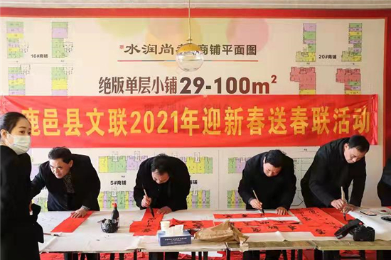 “我是做生意的,能帮我写一幅跟生意有关的春联吗?”2月7日,寒风凛冽,鹿邑县水润尚都、水润上苑两个楼盘售楼处大厅却春意融融。鹿邑县文联、县书法家协会十余人走进社区挥毫泼墨为业主送上浓浓的新春祝福。