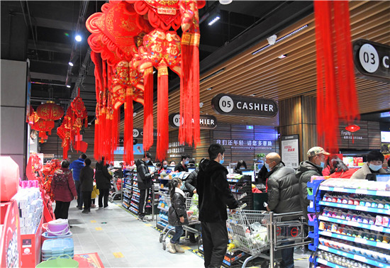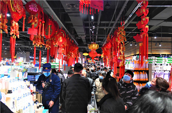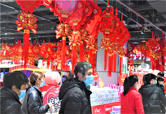 2月9日上午,商水县行政路一大型超市内年货充足,人流如织,市民自觉佩戴口罩进入商场“扫货”。
