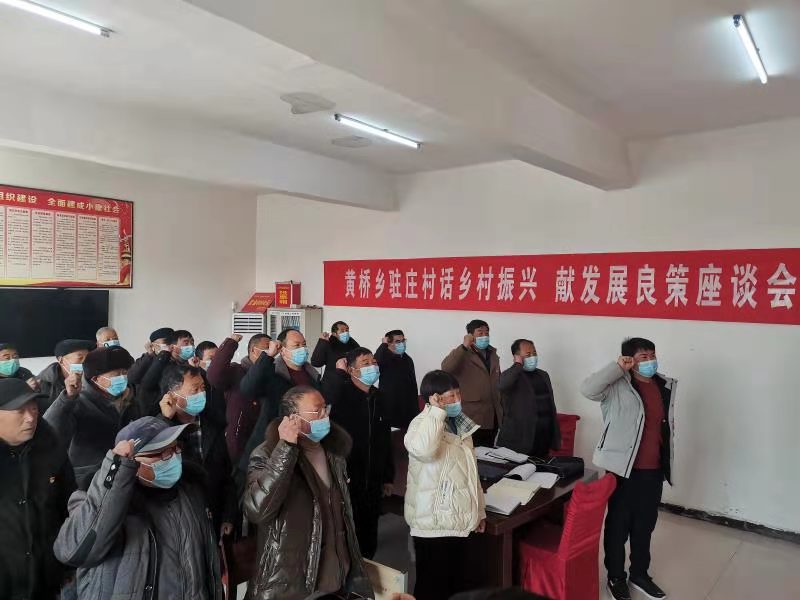 “我志愿加入中国共产党……”驻庄村党支部书记刘广涛带领与会党员开展重温入党誓词活动,面对党旗,举起右手,党徽在胸前熠熠闪耀。随后,以“微党课”的形式,刘广涛通报了家乡变化,驻村第一书记张振芳领学了《习近平调研指导过的贫困村脱贫纪实》,与返乡党员们共话振兴路,畅谈发展良策。