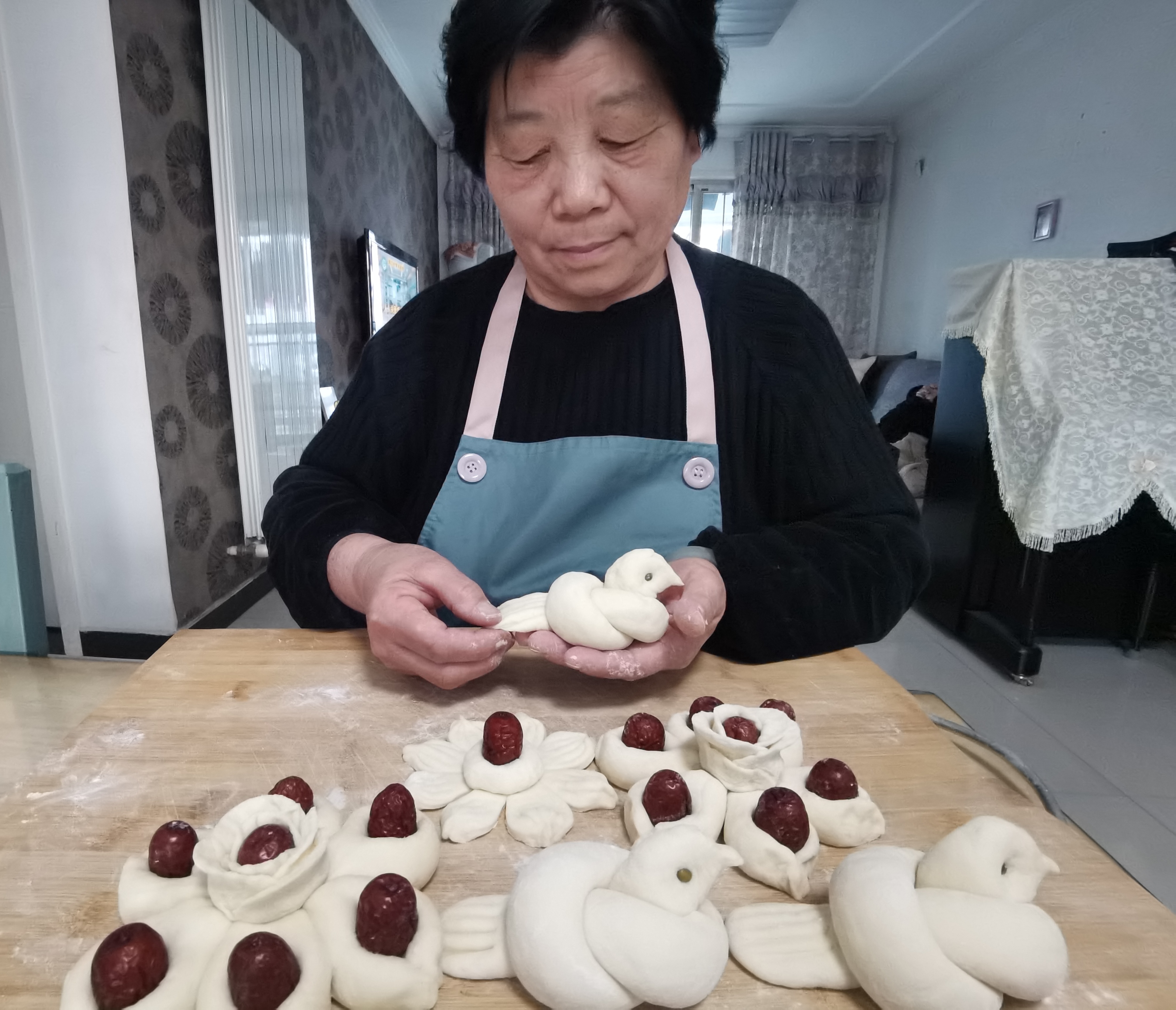 王大妈在蒸枣花馍,寓意着来年生活蒸蒸日上。