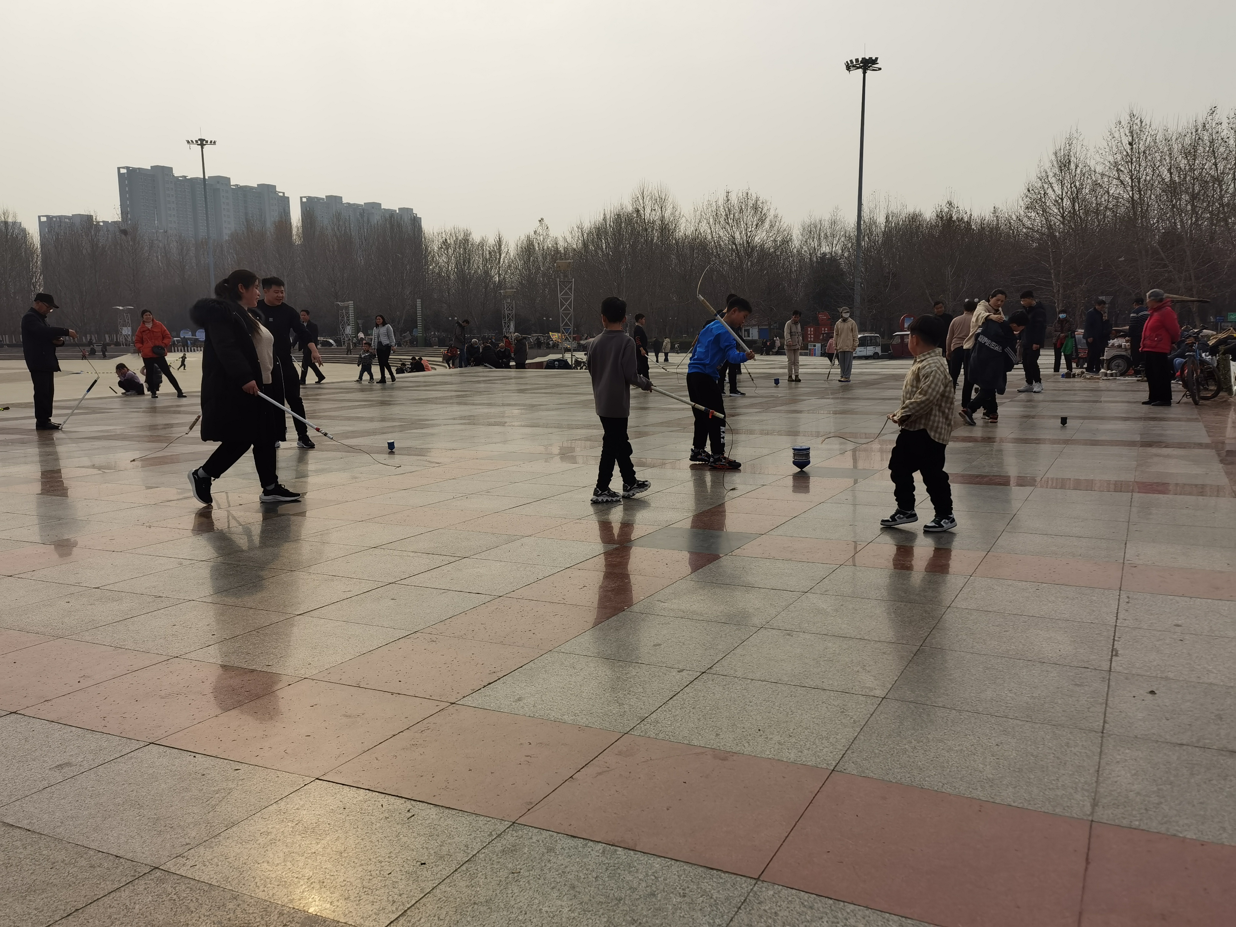 打陀螺运动强度适中,适合各个年龄阶段,男女老少皆宜。春节期间,天气晴好,我市市民纷纷走到室外,或锻炼、或游玩。陀螺以其多变的玩法,受到人们的喜爱,跑、跳、撞、叠,随心所欲,想怎么玩就怎么玩。公园和广场上的人们不论老人还是小孩,都玩得十分尽兴。一起来的小伙伴们互相比试,看谁的陀螺个大、谁的陀螺转得好。