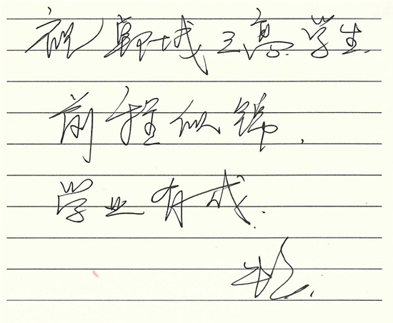 朱婷虽然很少回家,但是一直关注老家郸城的发展变化,特别关注郸城的教育发展,当她得知郸城三高率先提炼出“孝、勤、韧、忠、济”为核心的朱婷精神,并把这种精神作为郸城三高学子的精神引领时非常感动,为郸城三高始终坚持立德树人的教育理念而高兴,为郸城三高学子的拼搏进取精神而欣慰,为郸城三高办学成果而点赞,并欣然写下:“ 祝郸城三高越来越好,圆农家子弟大学梦;祝郸城三高学生前程似锦,学业有成。”