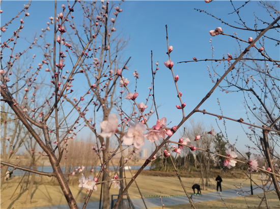 在河堤上,不乏有老年人,走走站站,欣赏春日美景的同时不忘拍照留念。