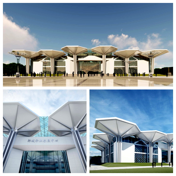 其中,伞业产业园电子商务服务中心项目由中国一冶承建,会展中心的设计概念以“伞启郸兴”为主题,基于对本土特色文化的深入解读、同时结合“伞”的具体特征,提炼伞盖、伞骨、伞柄的特殊形象为基本元素。建筑主立面以八个巨大伞形构架依次展开,巨型的尺度、新颖的造型有极强的昭示性,装饰幕墙八边形的单元分割也隐喻了伞盖的造型,创新的视觉形象为伞业产业园增加了新的注解。会展中心整体的建筑风格充分展示了郸城伞业产业园的核心价值,形成独具特色的地标形象。