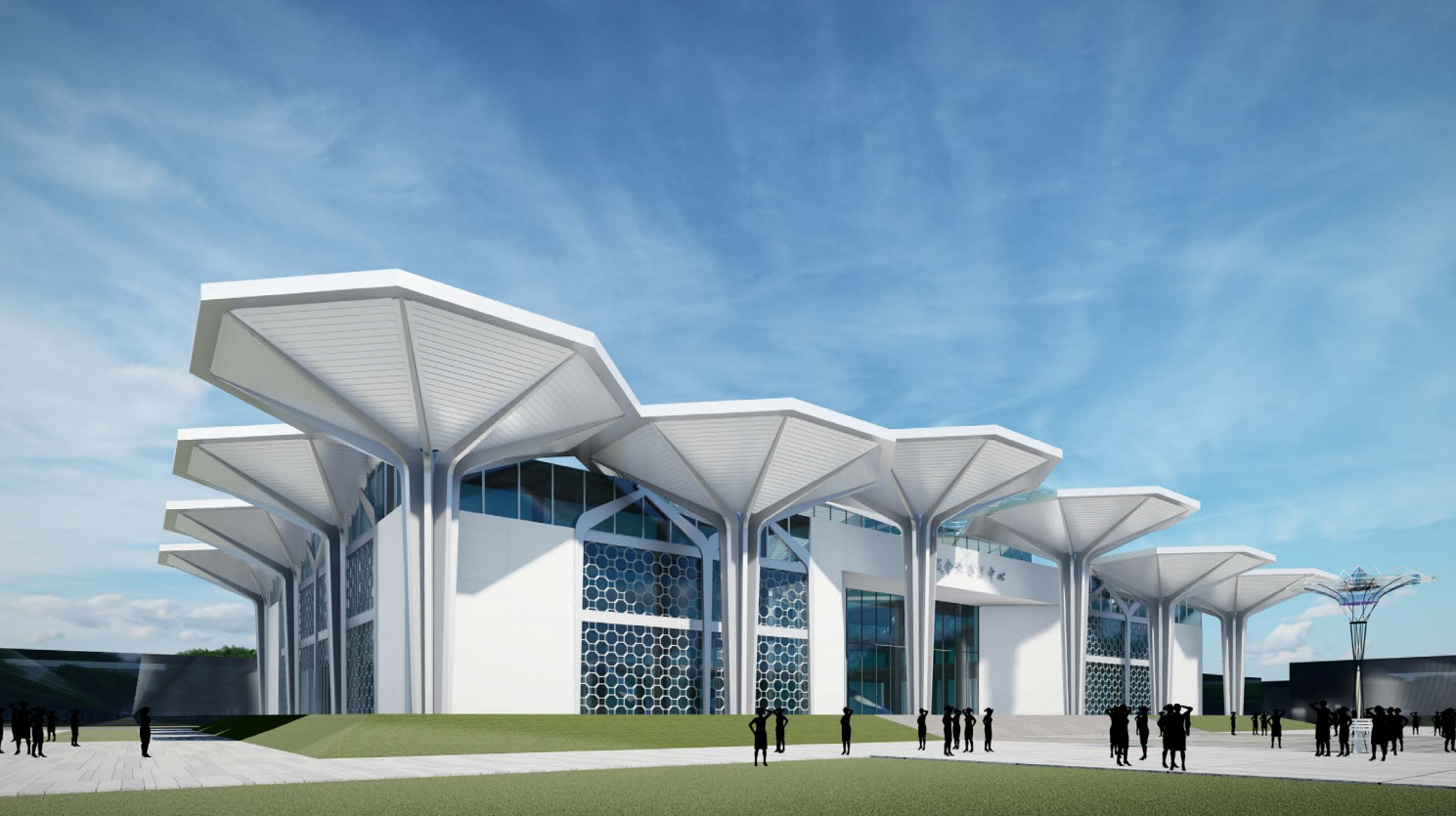 郸城县伞业产业园电子商务服务中心项目是郸城县伞业全产业链展销的窗口项目、展示项目。会展中心的设计概念以“伞启郸兴”为主题,基于对本土特色文化的深入解读、同时结合“伞”的具体特征,提炼伞盖、伞骨、伞柄的特殊形象为基本元素。建筑主立面以八个巨大伞形构架依次展开,巨型的尺度、新颖的造型有极强的昭示性,装饰幕墙八边形的单元分割也隐喻了伞盖的造型,创新的视觉形象为伞业产业园增加了新的注解。会展中心整体的建筑风格充分展示了郸城伞业产业园的核心价值,形成独具特色的地标形象。