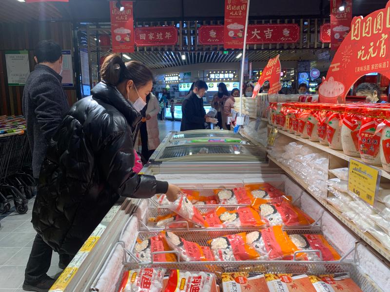 在汤圆价格方面,与往年基本持平。传统黑芝麻、花生、五仁等口味的普通包装的汤圆价格均在6.9至11.9元/袋不等,口味新奇且包装精美的汤圆价格则在9.9至19.9元/袋左右。据万果园家庭茂的工作人员介绍,原价为12.9元/袋,现促销价为9.9元/袋的思念牌大黄米黑芝麻汤团销量最佳,但已售罄,“一颗难求”;思念牌坚果汤圆凭借奇特的口感成为“弄潮儿”,深受年轻人追捧;三全牌经典大汤圆则被评为“最受大众喜爱汤圆”,受众范围广。一名正在选购汤圆的市民说:“每年元宵节俺都会买点汤圆,自己家吃的不在乎价钱,好吃就行。往年买的最多的还是黑芝麻馅,今年换换这种水果馅的小小汤圆尝尝,主要我家小孩喜欢吃这种新鲜的,贵点也会给她买。”