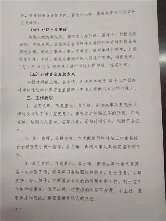 在此需要提醒的是,纳税人缴纳契税后,须携带本人身份证、银行卡、契税完税证明、购房发票、房屋购买合同原件及复印件等资料到商品房所处乡镇、街道办事处办事大厅审核,填写申请补贴单,并提交复印件。届时,乡镇、街道办事处组织人员逐户审核,确保无误。