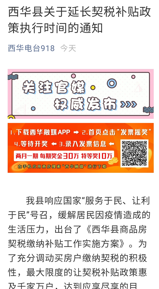 2月25日,西华县综合治税领导组发布一条关于延长契税补贴政策执行时间的通知。