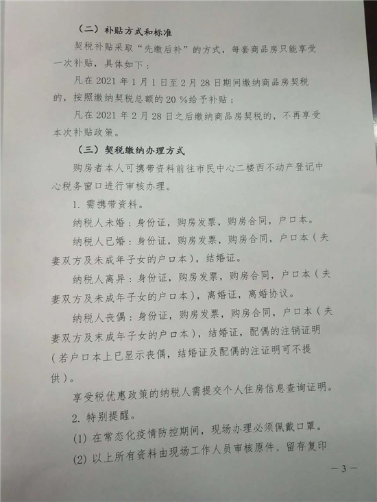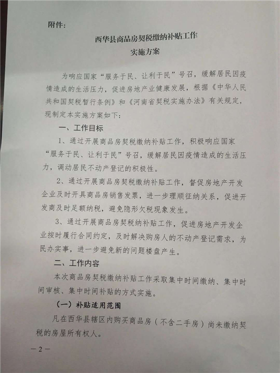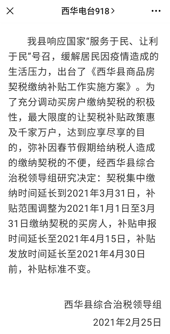 通知称,西华县为响应国家“服务于民、让利于民”号召,缓解居民因疫情造成的生活压力,促进房地产健康发展,出台了《西华县商品房契税缴纳补贴工作实施方案》。为了充分调动买房户缴纳契税的积极性,最大限度的让契税补贴政策惠及千家万户,达到应享尽享的目的,弥补因春节假期给纳税人造成的缴纳契税的不便,经西华县综合治税领导组研究决定:契税集中缴纳时间延长到2021年3月31日,补贴范围调整为2021年1月1日至3月31日缴纳契税的买房人,补贴申报时间延长至2021年4月15日,补贴发放时间延长至2021年4月30日前,补贴标准不变。