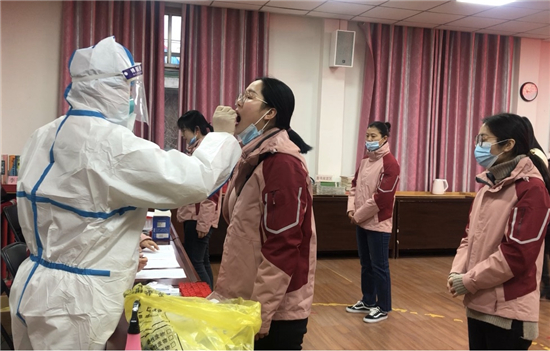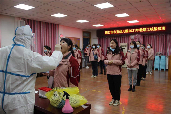 为保证市直幼儿园顺利开学,按照市教体局统一安排部署,近日,周口市妇女儿童医院核酸检测组对市直幼儿园全体教职工百余人顺利进行了新冠肺炎核酸检测,检测结果在校老师全部健康,无异常。图为市直幼儿园教职工在进行新冠肺炎核酸检测。