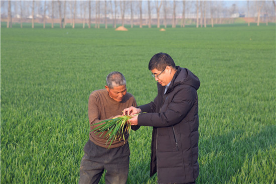 3月3日,商水县黄寨镇农技人员在察看小麦长势。近日,我市普降小到中雨,旱情解除,土壤墒情改善,有利于冬小麦起身返青,为农业丰收打下基础。周口日报·周道客户端记者 付永奇 摄