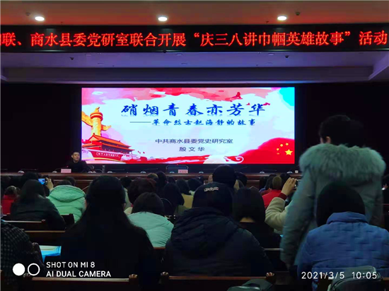3月5日,商水县妇联、商水县党史研究室“庆三八讲巾帼英雄故事“活动在商水迎宾馆东三楼会议室举行。认真学习贯彻2月20日习近平总书记在党史学习教育动员大会上的重要讲话精神及3月1日召开的河南省党史学习教育动员大会精神。