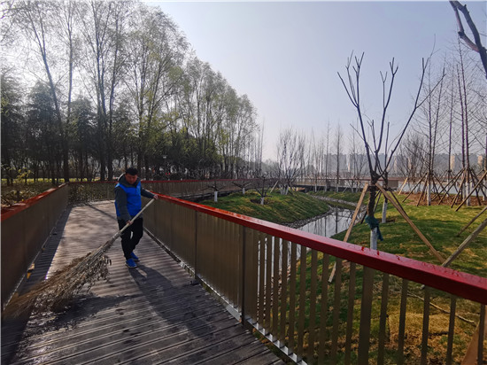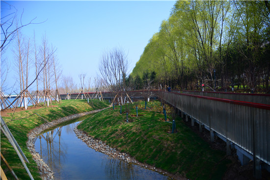 3月9日,鱼翔湖曲廊环绕、新树挺立,水面波光粼粼,不少市民漫步其中感受这水清岸绿 鱼翔浅底的美景。