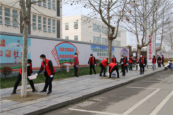 另一边,党员教师则手拿滚刷,给校门口公园北路两侧的法桐树刷上白灰、红漆,宛若给树穿了件新衣。伴随着他们忙碌的身影,一排排法桐树焕然一新,整齐的“红白裙子”看上去格外漂亮。