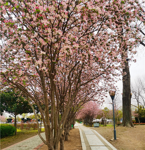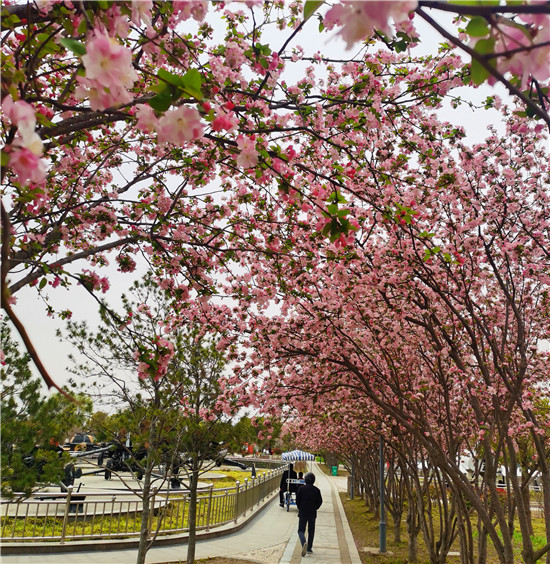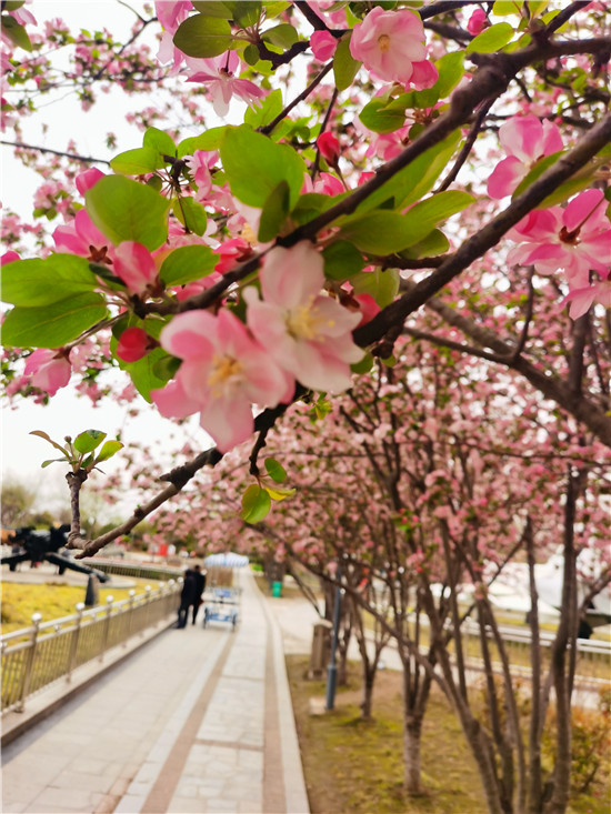 日前,周口公园里的海棠纷纷绽放。在公园内的道路上,海棠已进入盛花期,粉色的花朵如梦似幻,令人沉醉。