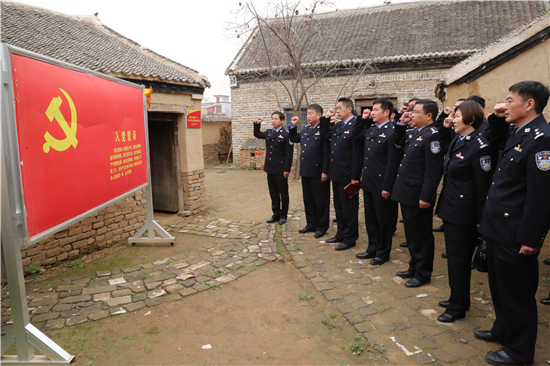 与此同时,在岗张村支部旧址门前,面对庄严的党旗和警旗,该县公安局政办室主任邱亚龙带领全体党员民警庄严地高举右拳,重温了入党、入警誓词。