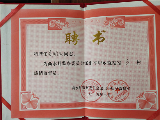 “我乡刘楼村党支部书记吴明玉敢于担当,一身正气,认真履行村干部的工作职责,在全乡起了很好的示范作用,经乡纪委研究报请乡主要领导同意,特对吴明玉进行通报表扬,即日起聘请吴明玉同志为平店乡廉情监督员。请吴明玉同志上台接受聘书......”近日,商水县平店乡召开例会,县纪委委员、乡党委副书记邵国闯宣读了一份“特殊通报”,并当场颁发了聘书。