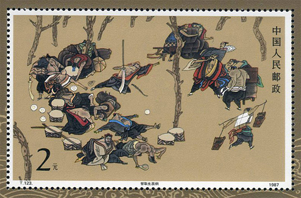 “那七个贩枣子的客人,立在松树旁边,指着这一十五人说道:‘倒也!倒也!’只见这十五个人,头重脚轻,一个个面面厮觑,都软倒了。……杨志口里只是叫苦,软了身体,挣扎不起。十五个人眼睁睁地看着那七个人都把这金宝装了去,只是起不来,挣不动,说不得的。”