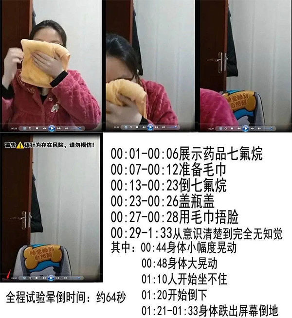 视频中,“陈大夫”用沾满七氟烷的毛巾捂住口鼻后,从意识清晰到失去知觉,全程用时约一分多钟。她本人认为,自己晕倒的时间“非常短,已经可以用‘一捂即晕’来形容了。”