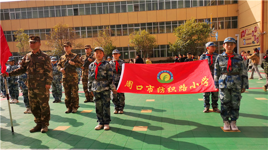 3月25日,周口纺织路小学学生正在参加“国防教育进校园”主题活动,一天下来,站军姿、学旗语、体验迫机炮、观看战术表演和战争情景模拟等,让孩子们懂得“祖国神圣不可侵犯”,爱军报国意识大大增强。