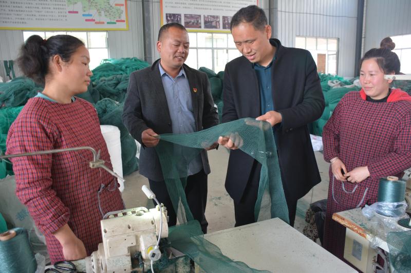 3月27日,商水县平店乡李岗村“商水县龙巢网业公司”经理罗国昌向村党支部书记李金棋(左二)介绍渔网编织产业产销带贫情况。罗国昌和妻子刘清华2009年创办渔网编织加工厂、2017年扩建新区,现有3个大型生产车间库房,发展30多个分厂、40多个联系点,年产各种成品渔网500万条,产品销往国内江苏、安微、山东、河北、湖北等10多个省区和30多个沿海县市水产公司,部分出口到俄罗斯及东南亚地区,年创产值约1.6亿元,精准帮扶225户群众脱贫,带贫群众有1万余人。