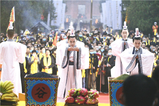 祭祀现场的长条桌上摆着水果和五谷,祭祀活动按照传统礼仪进行,在庄严的古乐及礼炮声中,先由身着古装的群体祭祀者以古老礼俗进行祭拜,而后进行献爵、恭读祭文,随后参加祭祀活动的社会各界代表献上花篮,依次祭拜,表达对我们一代先哲的缅怀。