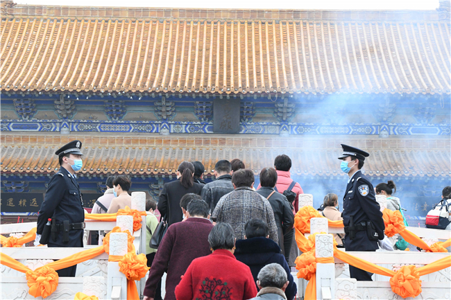 在太清宫、明道宫景区主要活动点,全力做好人流、车流疏导和受理报警求助等工作;执勤民警还及时为走失儿童家长、行动不便的老人等提供热情周到的服务;民辅警积极向过往香客宣传“金钟罩”防诈骗知识,耐心细致地手把手教群众注册“金钟罩”;交警大队根据职责任务设置了驻地警卫组、机动应急组、事故应急组,大队领导靠前指挥,因情施策,合理调度,全力保障活动现场道路交通安全畅通。③2