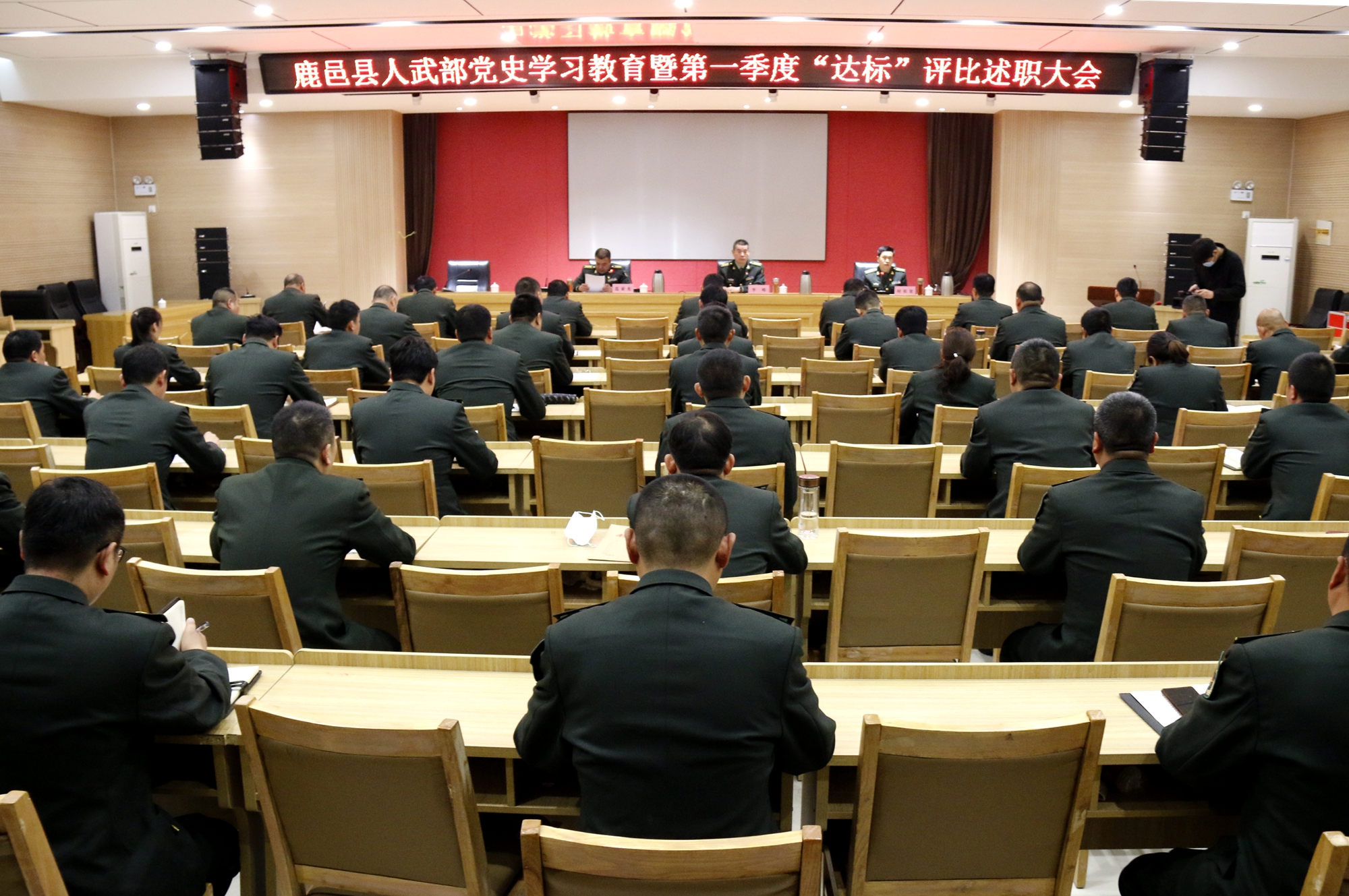 3月31日上午,鹿邑县人武部召开党史学习教育暨第一季度“达标”评比述职大会。县人武部副部长时祖奎主持会议,部长范亚光、政委李峰出席会议。县人武部机关现役干部、文职人员、职工和乡镇、办事处全体专武干部参加会议。