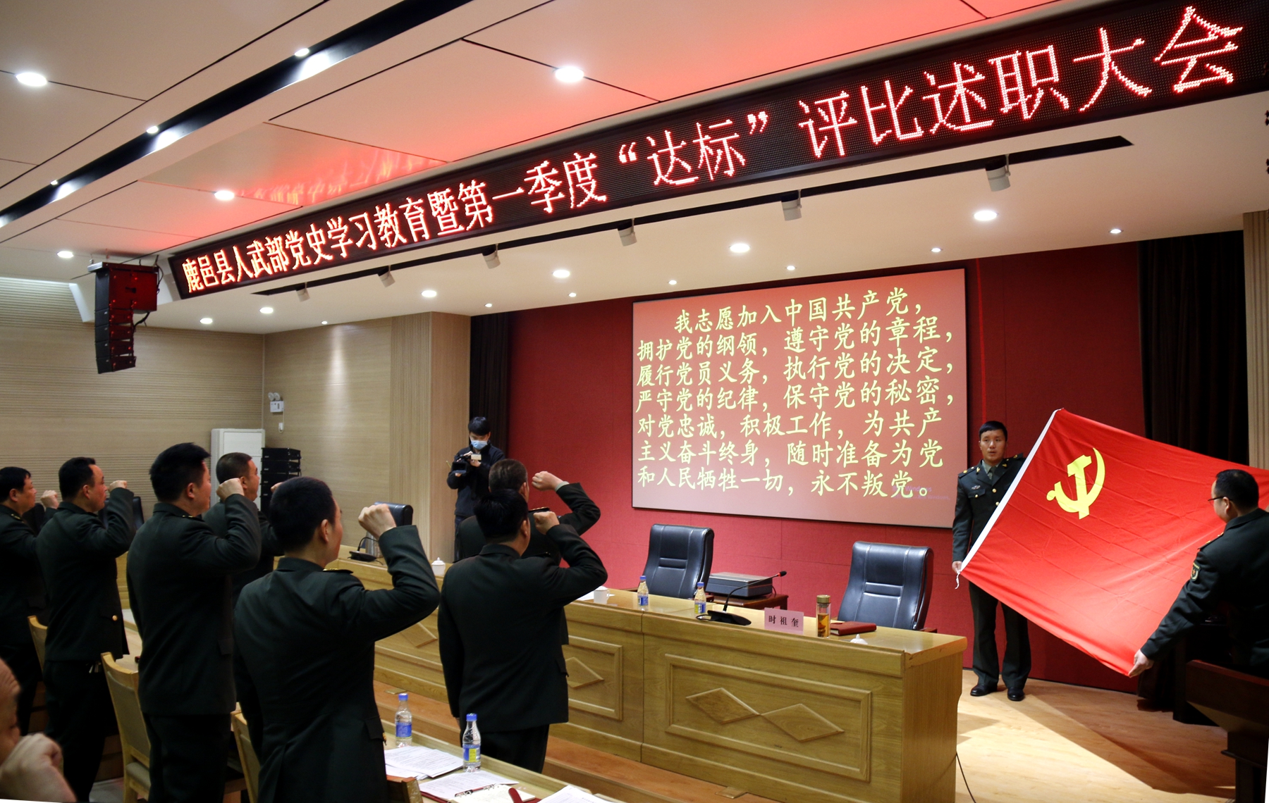 会后,县人武部政委李峰带领大家过集体“政治生日”,在党旗前,全体人员庄严的面对党旗,举起右手重温了入党誓词。