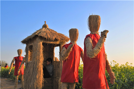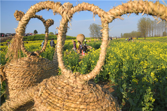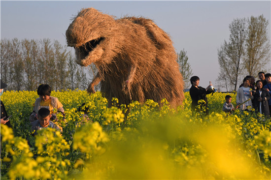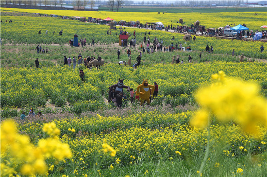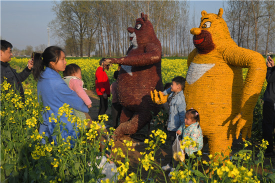 4月5日上午,在商水县邓城镇沙颍河畔万亩油菜花海,来自周边县市区和附近乡镇的群众一拨接一拨地驾车到这儿打卡游玩,特别是卡通稻草人景点内热闹非凡。