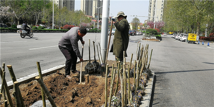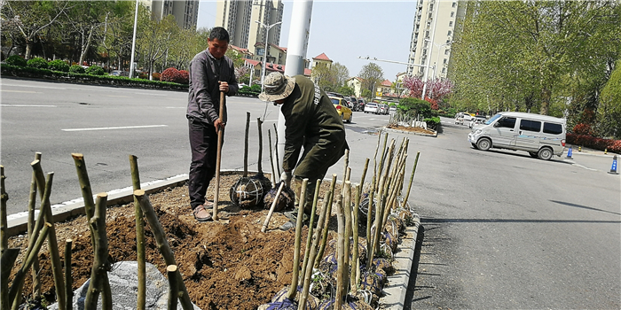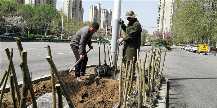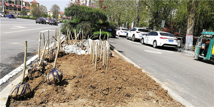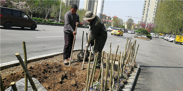 仲春时节,我市积极打造街头游园、口袋公园,增加市民休闲游乐场所。图为园林工人正在施工。②7