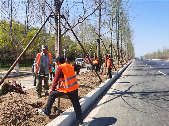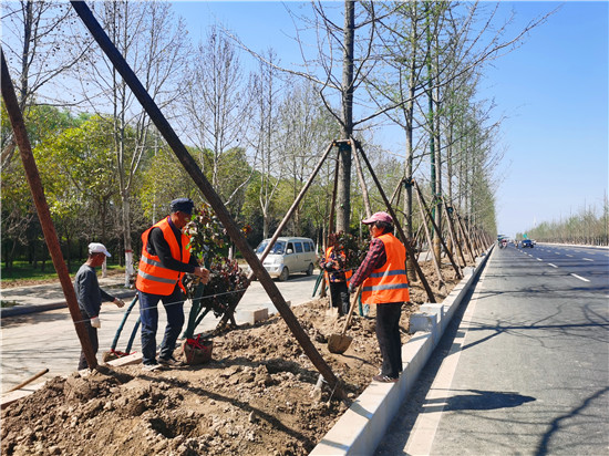 日前,气温回暖,春光明媚,正是种植树木、养护苗木的好时节。连日来,在周口大道北段,园林工人利用现在好时节,忙于栽植各种树木,建设绿化工程。