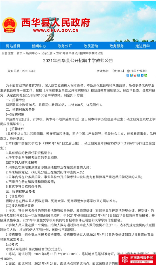 4月8日,记者从西华县人民政府网站获悉,为全面贯彻党的教育方针,深入落实立德树人根本任务,不断深化西华县教师队伍改革,吸引更多优秀毕业生到西华教育一线工作,根据《河南省事业单位公开招聘规程》和西华县教育编制情况,经西华县委、县政府研究,决定面向社会公开招聘100名中学教师。