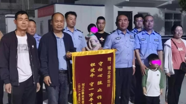 5月26日,城北办事处朱楼村6名村民一起前往城北派出所,送上一面绣有“守初心阻止诈骗 担使命守一方平安”鲜红锦旗。