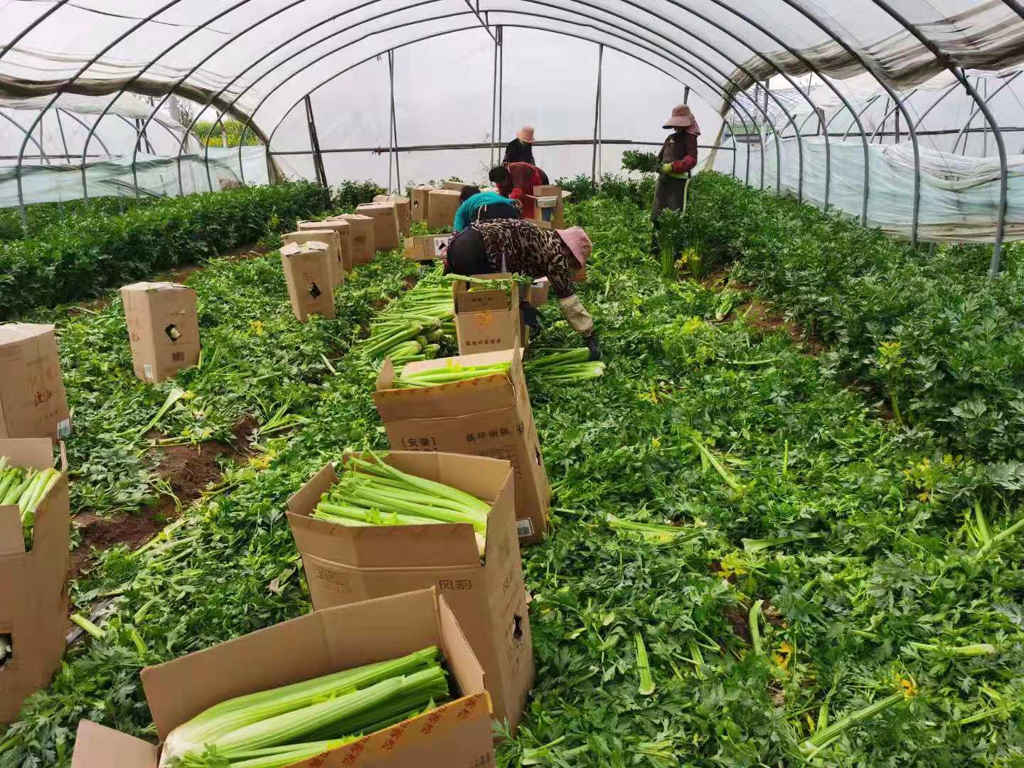 走进万亩芹菜种植基地蔬菜温棚,一股伞形科植物特有的芳香充满鼻腔。抬眼一瞅,装箱好的芹菜整齐码放成垛,温棚深处,还有大片未收割的芹菜,挺直鲜嫩,绿意葱茏。大棚里菜农们收割、打包、贴二维码一气呵成,道路两旁十几名从全国各地赶来的收购商从菜农手中接过包裹急忙装车。
