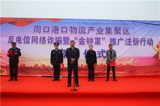 为打击治理电信网络诈骗犯罪,降低诈骗案件发生率,4月13日,周口港区举办反电信网络诈骗宣传暨“金钟罩”推广注册行动启动仪式,宣传反电诈知识,推广公安部门推出的反诈骗系统平台“金钟罩”。港区党委书记孙鹏到场宣布行动正式启动,港区党委委员、纪委书记李素芹,公安分局局长康群泉在仪式上讲话。