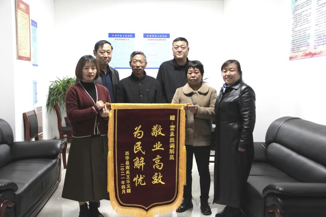 “要不是雷调解员出面调解,我的钱还不知道什么时候能要回来呢,这可帮了我们大忙……”4月13日上午,当事人王某将一面印有“敬业高效 为民解忧”的锦旗送至西华县法院政协委员调解员雷永胜手中,对其耐心高效的调解工作表示衷心感谢。