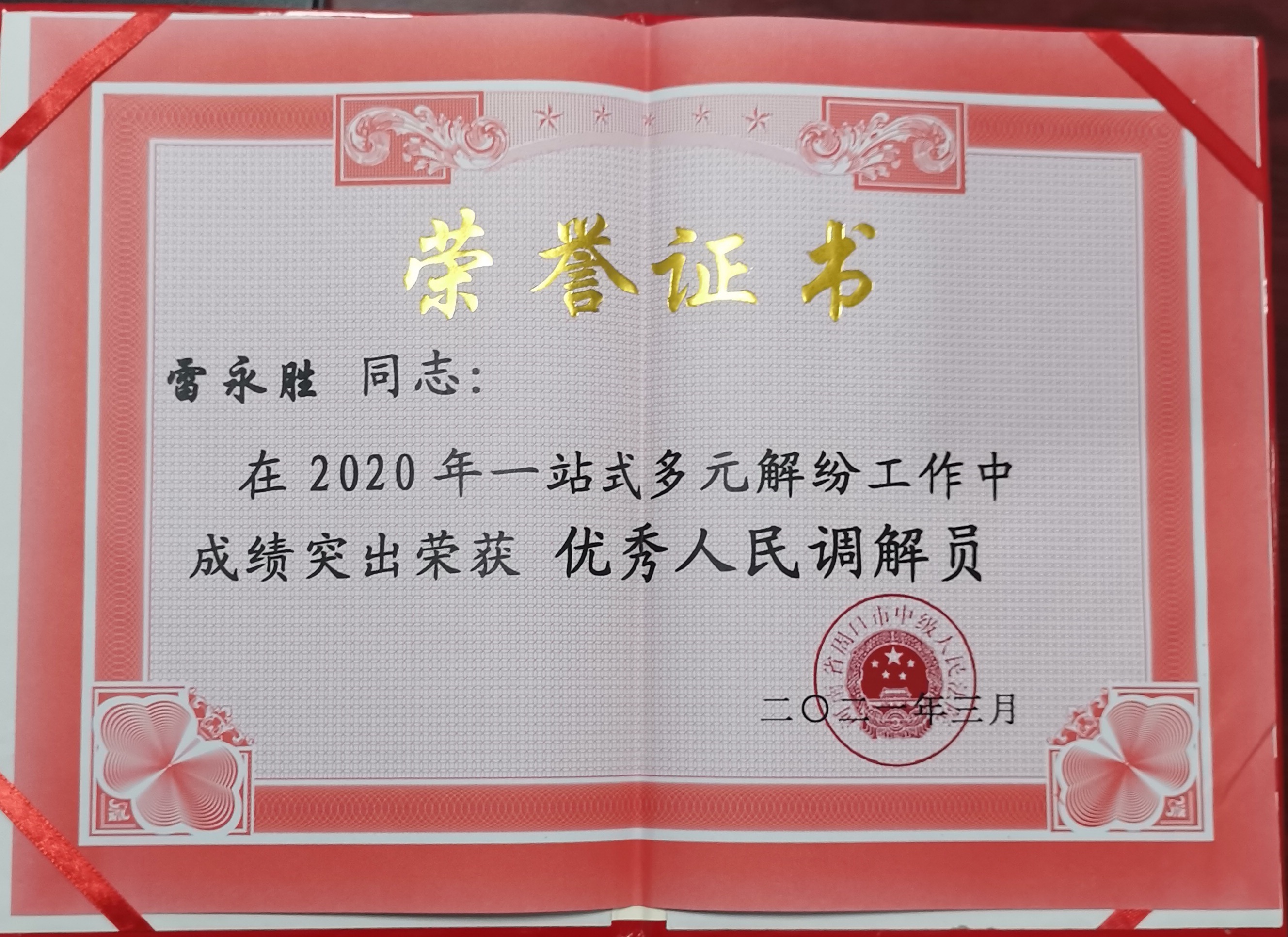 自2020年5月以来,雷永胜调解员已累计接受各类案件近200件,成功调解近百件,助力法院诉前调解工作迈入先进行列,化解了大量社会矛盾,为维护社会和谐稳定作出了积极贡献。日前,雷永胜被周口市中级法院评为“2020年度优秀人民调解员”。