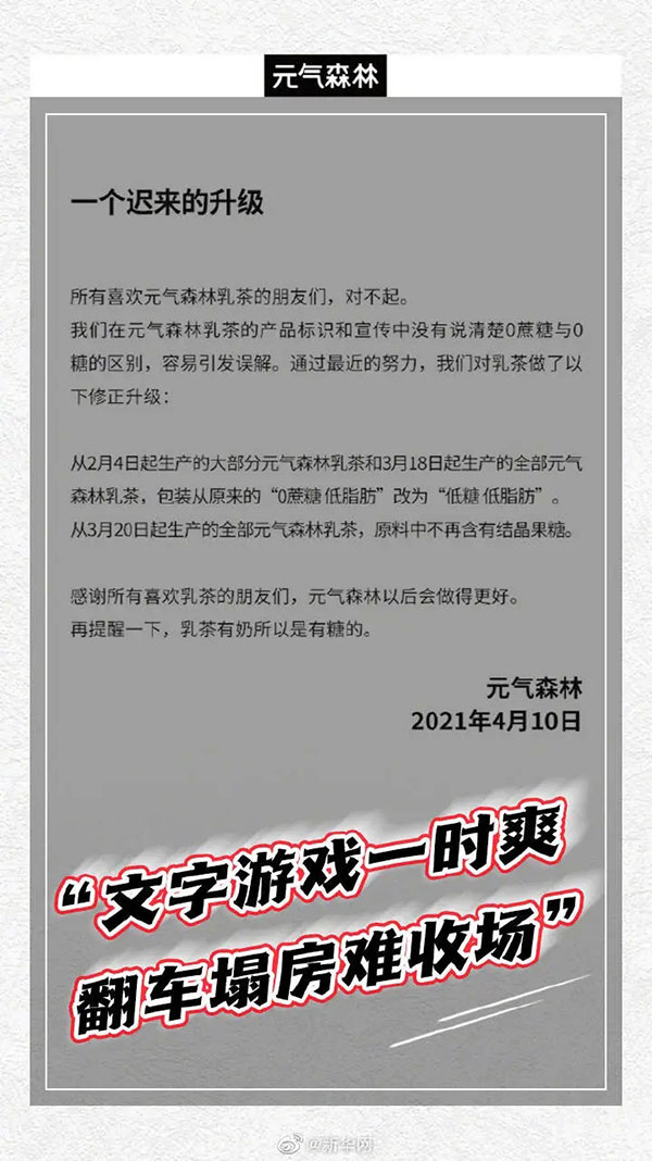 4月10日,国内饮料品牌元气森林因宣传0蔗糖致歉,称在乳茶产品的产品标示和宣传中,没有说明“0糖”和“0蔗糖”的区别,容易引发误解。元气森林表示,近期已对乳茶产品做了修正升级,即从2月4日起生产的大部分乳茶和3月18日起生产的全部乳茶,包装从原来的“0蔗糖 低脂肪”改为“低糖 低脂肪”。