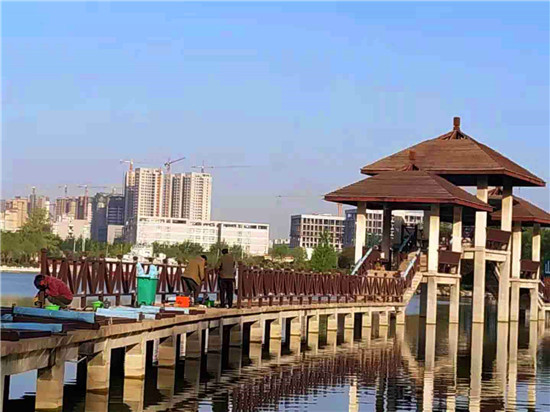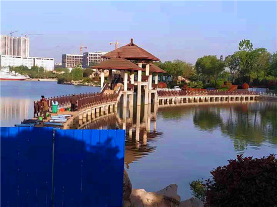 近日,位于文昌大道的周口公园启动了对水上栈道的维修。周口公园的水上栈道和亭榭是一道美丽的风景,成为人们游园打卡之地,然而因建造时用的是木材,历经风雨,朽坏严重,存在安全隐患,周口公园方面于去年将之封闭。记者在现场看到,工人已经将木质扶栏、道上木板拆除,正在安装铁护栏。铁护栏油漆成棕褐色,依然保持原栈道的风格和色调。②7