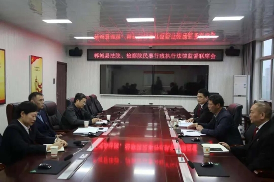为进一步推动教育整顿工作,认真落实省院、市院关于开展民事行政执行法律监督专项活动的要求,推动民事、行政检察工作顺利开展,解决人民群众反应强烈的执行难、执行乱等问题,4月20日下午,郸城县检察院党组书记、代检察长陆智明和县院党组成员、副检察长马立强以及第四检察部员额检察官李平会同县法院有关领导召开了民事行政执行法律监督联席会。县法院党组书记、院长王洪彬应邀出席会议。