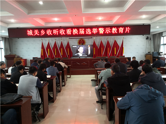 为切实树好正确导向,选准干部,把班子配强,圆满完成换届工作,4月26日上午,商水县城关乡组织收看换届选举警示教育片。乡党委班子成员、脱贫责任组长、驻村第一书记、村党支部书记及乡机关全体人员集中收看了换届选举警示教育片。
