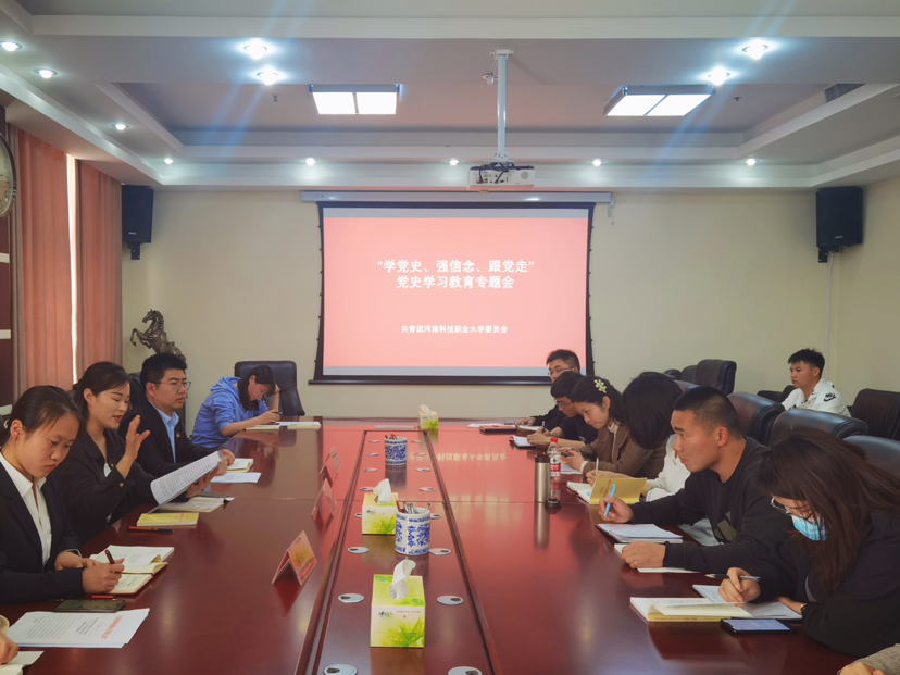 为认真贯彻习近平总书记在党史学习教育动员大会上的重要讲话精神,引领广大党员深入学习党的历史,深化青年厚植爱党、爱国、爱社会主义的情感,4月29日,共青团河南科技职业大学委员会召开“学党史、强信念、跟党走"党史学习教育专题会。