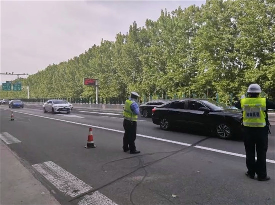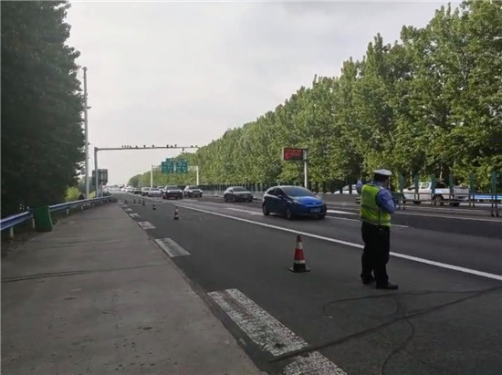 图片说明:交警在大广高速与商南高速互通立交南2062公里附近指挥交通