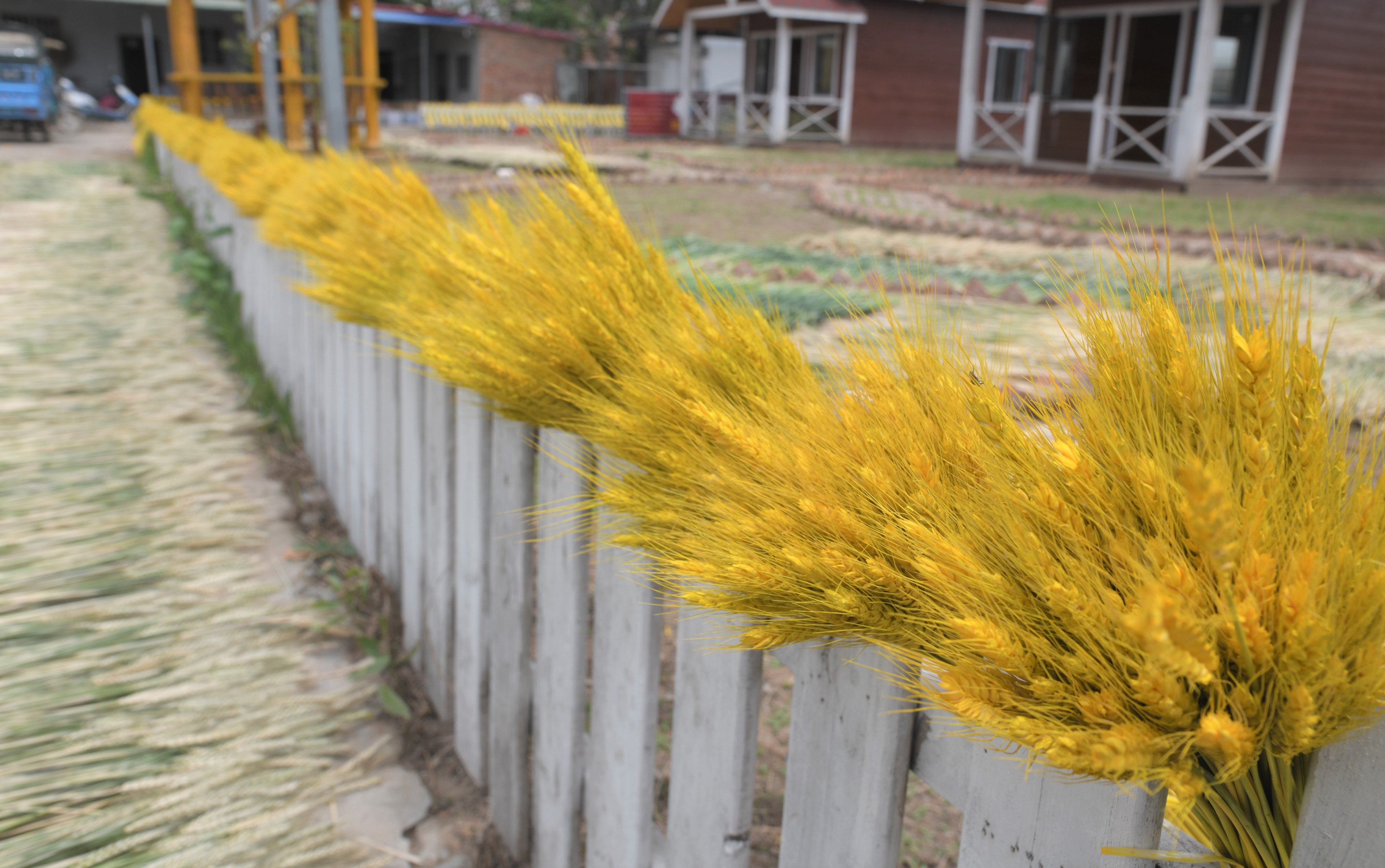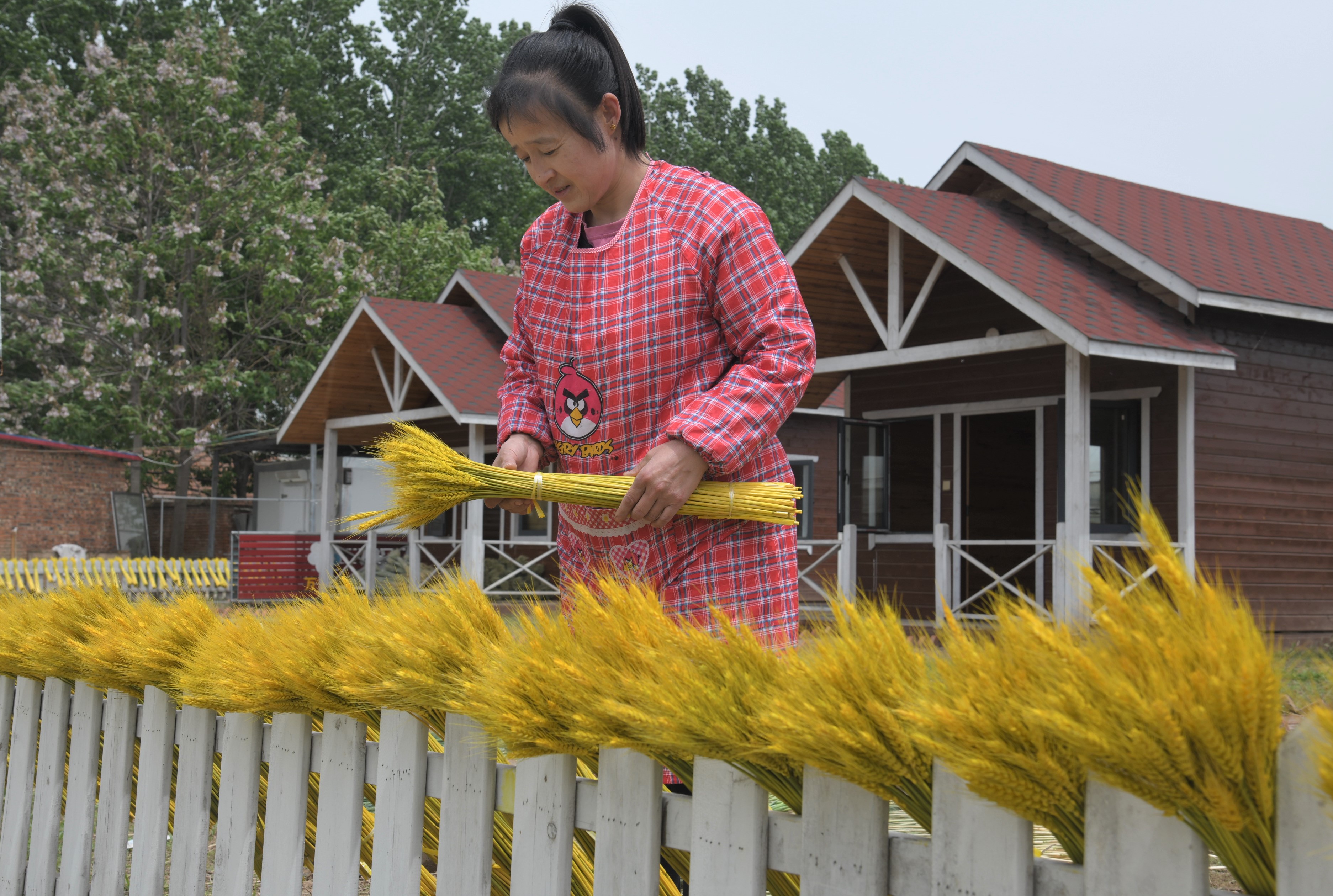 5月7日,商水县平店乡雒庄村民正在察看晾晒中的彩色麦秸秆。该乡村民李东洋今年种植大麦10多亩,在灌浆之初提前收割晾晒,并把麦秆染成黄、蓝等不同颜色,用于大中城市的商超装饰,由于大麦和“大卖”谐音,许多商家非常喜欢,产品供不应求,产值也翻了几番。②8