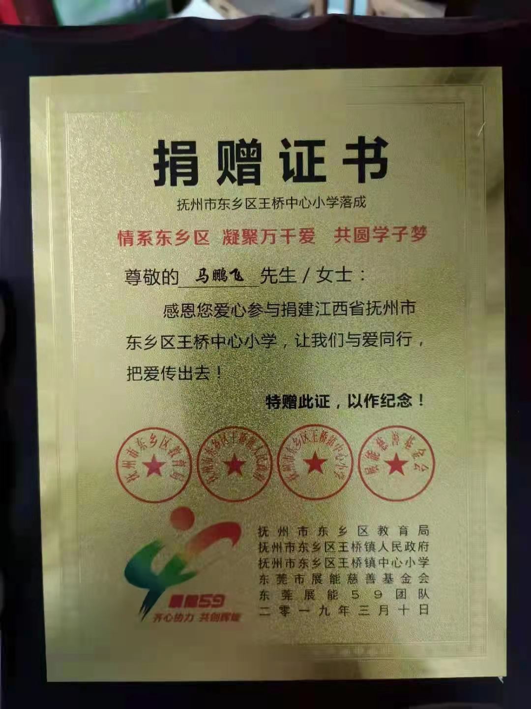 2019年,马鹏飞出资数万元,参与捐建了江西省抚州市东乡区王桥中心小学,凝聚爱心,共圆老区学子梦。3月,抚州市东乡区教育局、抚州市东乡区王桥镇人民政府、王桥镇中心小学,为马鹏飞颁发了捐建证书。