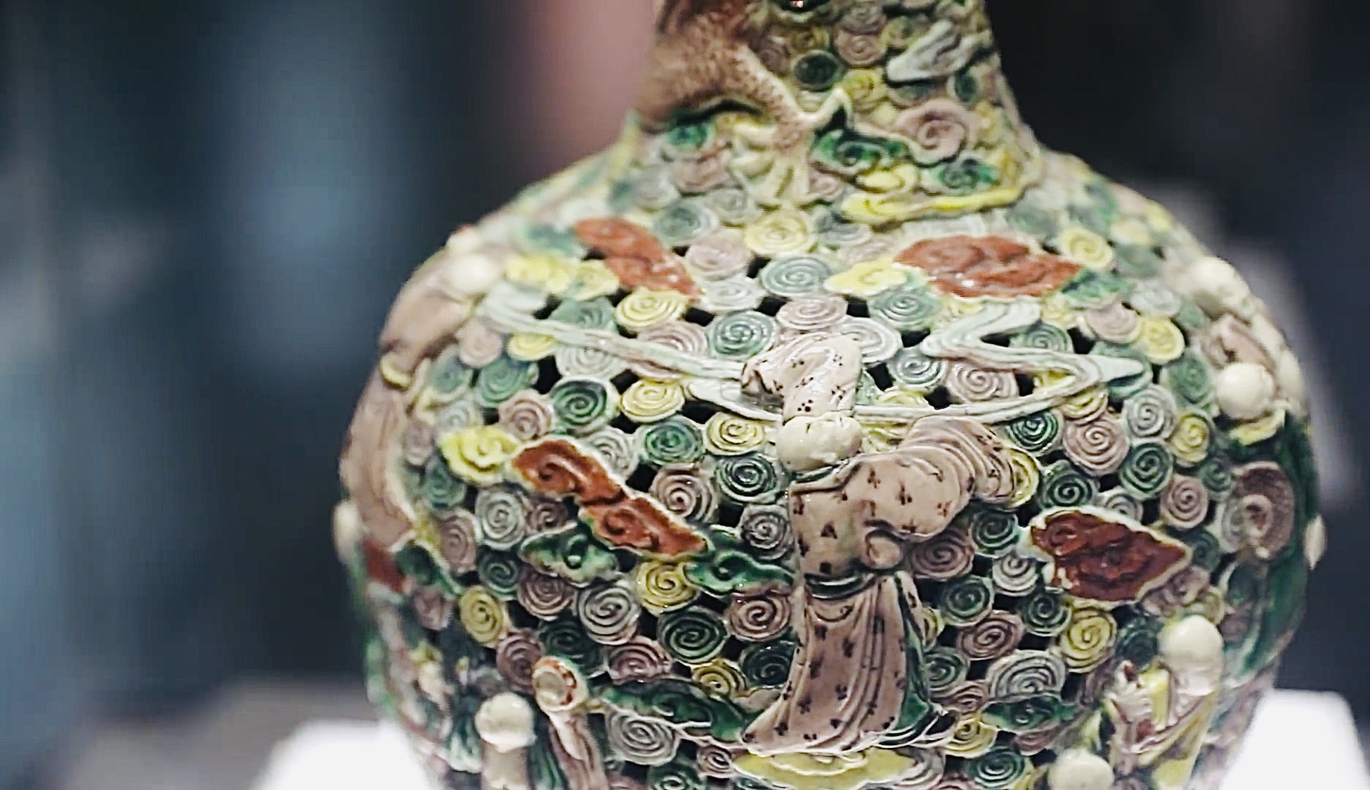 我的出生地在景德镇,但浑身上下又布满了西亚佛教元素。快看,红、粉、绿、黄的云朵像玫瑰花一样紧紧簇拥在一起布满我全身,成了我漂亮的衣裳,人称五彩祥云。祥云以浮雕、透雕、浅刻等技法,镂空凹凸,层层交错,立体感十足,像是3D版万紫千红的花海世界,吸引了十八罗汉来嬉戏打闹,笑的皱纹都出来了。他们三五成群凑在一起,形态各异,栩栩如生。他们面额饱满,鼻宽且丰,两眼微闭,两唇微翕,欲言又止,神态悠然自得,表情异常生动,衣纹随风飘扬、流畅自如、富有动感,整个画面和谐美好,像身处世外桃源,又如身临仙境天堂。