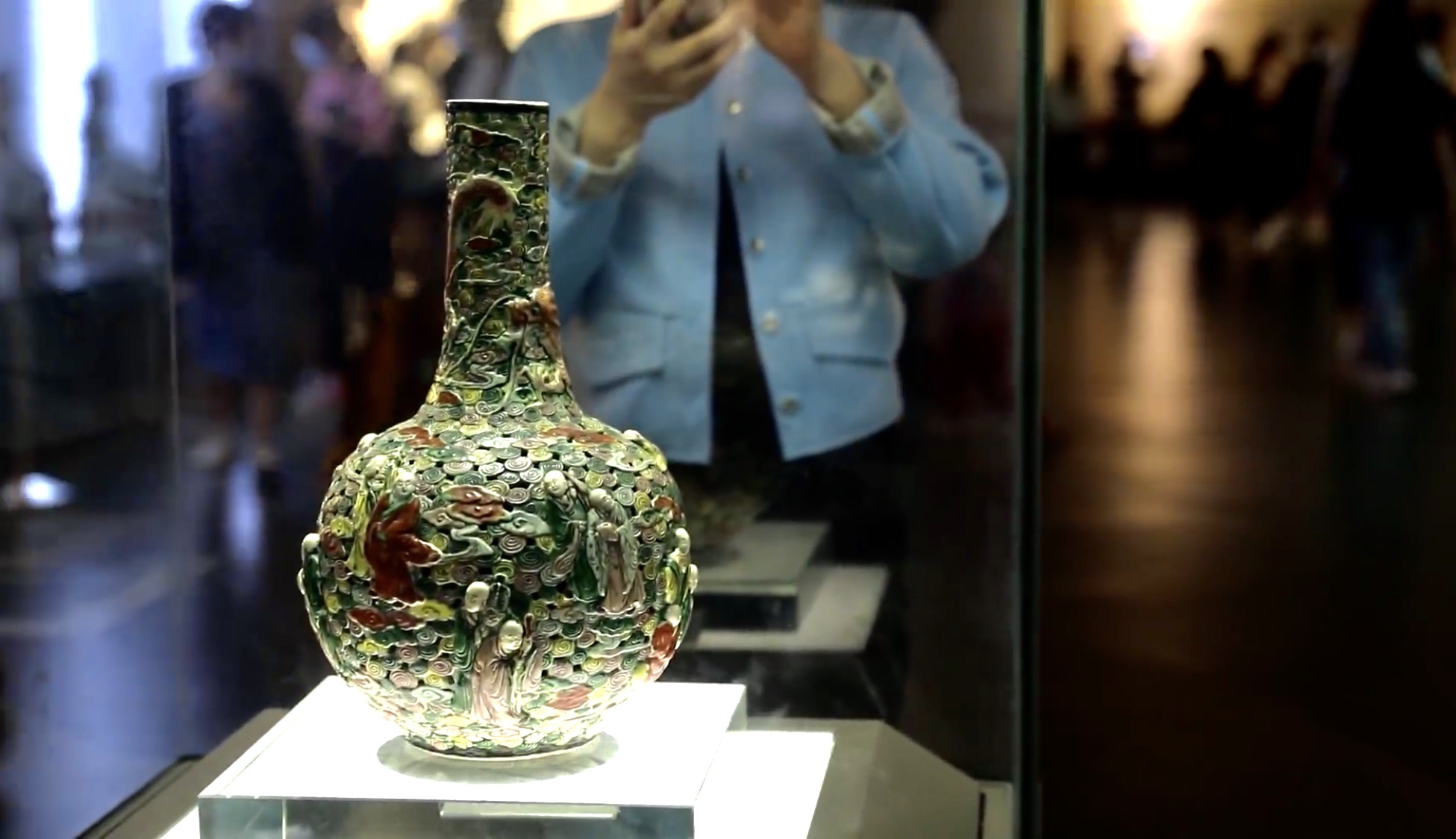 我是五彩透雕十八罗汉云龙瓶,又名古瓷流韵天球瓶。静谧的空间里,我站在周口市博物馆的玻璃展柜里,瞅瞅四周的兄弟姐妹,我偷偷笑了。虽没有长睫毛和双眼皮,但我可是个十足的“混血儿”。技艺精湛、图案华贵、色彩艳丽,我的稀有性和珍贵性常常让来访者惊叹不已。和青花瓷相比,我更加瑰丽多彩,人称文物界的“米兰·可儿”。