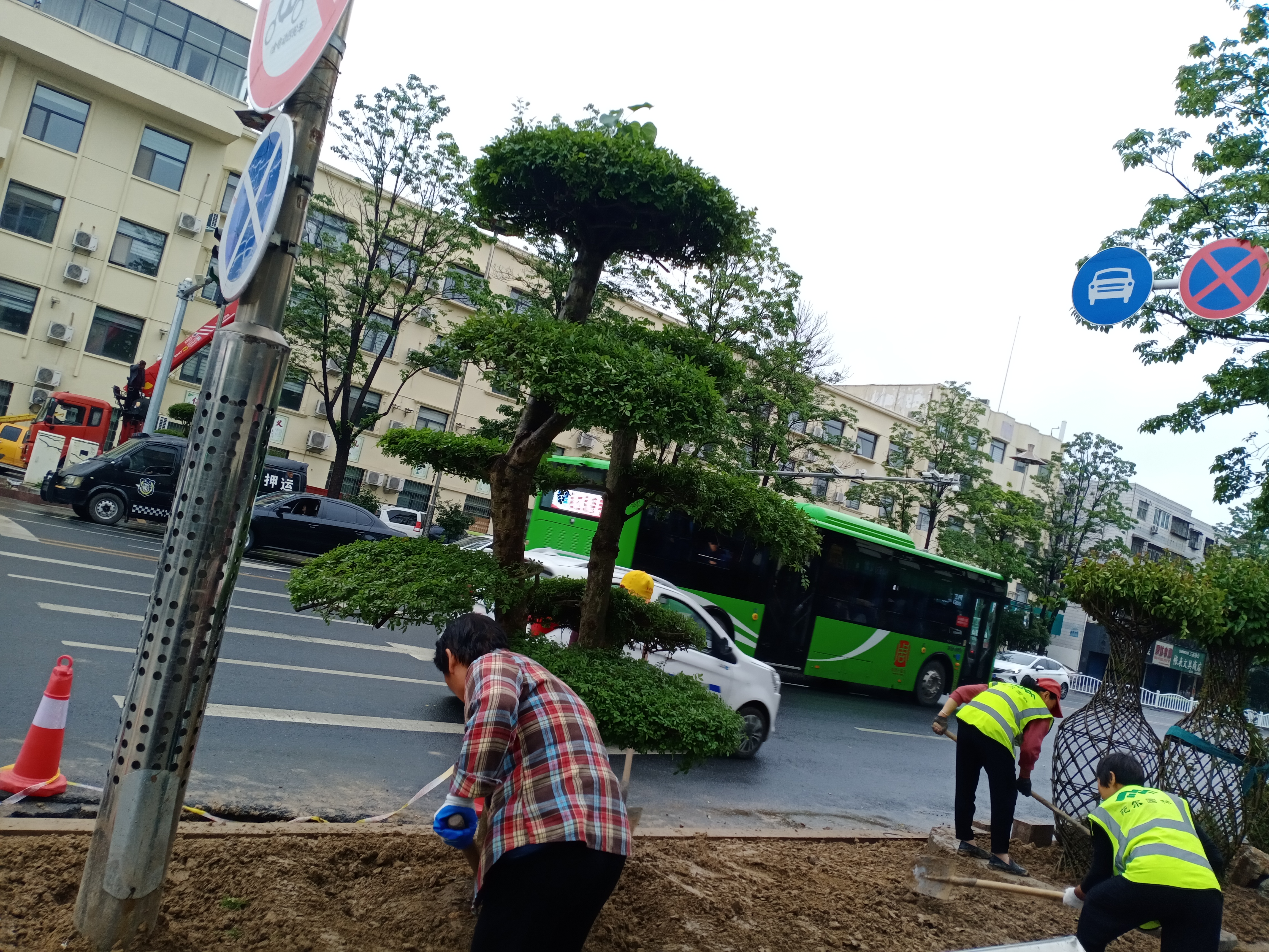 图片说明:5月15日上午,记者在周口市中心城区七一路与文明路交叉口看到,工作人员正在绿化带内设置造型别致的景观树,给过往市民带来美的享受。
