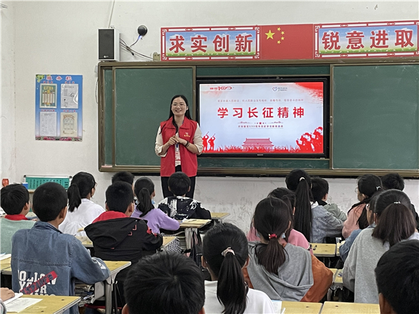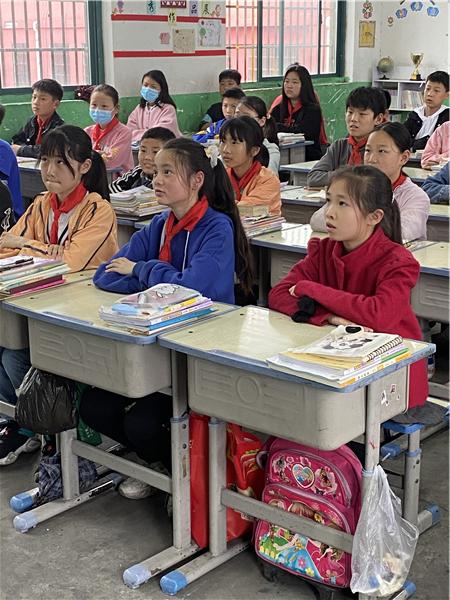 教室里,同学们聚精会神地听着老师讲革命先辈长征的故事,从巧渡金沙江到飞夺泸定桥,图文并茂,让学生们从小知党史、感党恩,一颗红心跟党走,传承红色基因。